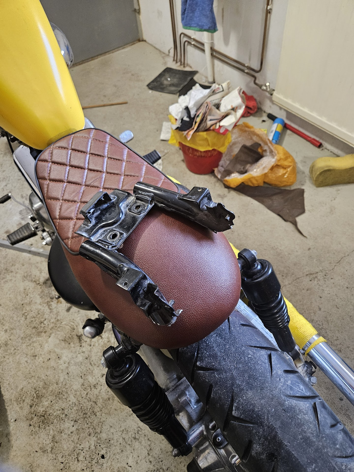 Satulan sovittamiseksi piti kuitenkin sahata pyörästä takaistuimen häkki pois. No eipä sillä niin väliä, häkki oli muutenkin kierossa onnettomuuden jäljiltä, joten annoin akkukäyttöisen minirälläkän laulaa ja melkoisen pian pyörästä oli sahattu pätkä poisnyt hommaa olisi jo huomattavasti vaikeampi peruuttaa. Pienen taistelun ja kiinnikkeiden tehtailun jälkeen sain istutettua satulan paikoilleen ja hämmästelin suu auki, miten täydellisesti se oikeastaan sopi pyörän ilmeeseen. Isona plussanahan tässä on se, että koska kyseessä on Honda cb:lle tehty cafe-jakkara, on pyörä edelleen mahdollista muuttaa kaksipaikkaiseksi vaihtamalla satulaa paremmin kahdelle soveltuvaan malliin; esim. brat-satulaan. Pitänee jossain vaiheessa tilata suora penkkikin, mut nyt mennään toistaiseksi tällä. Tein satulna reunaan jääneeseen rakoon roiskeläpän autotallin lattialla pyörineestä kumimaton palasta. Ajaa nyt ainakin toistaiseksi asiansa, mietin vielä, teenkö siihen metallisen palan jossain vaiheessa.